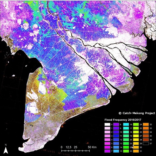 Optical and radar data from Sentinel-1, Sentinel-2 and Landsat of the hydrological year 2016/2017 have been used to derive a high-resolution flood frequency map for the entire Mekong Delta.